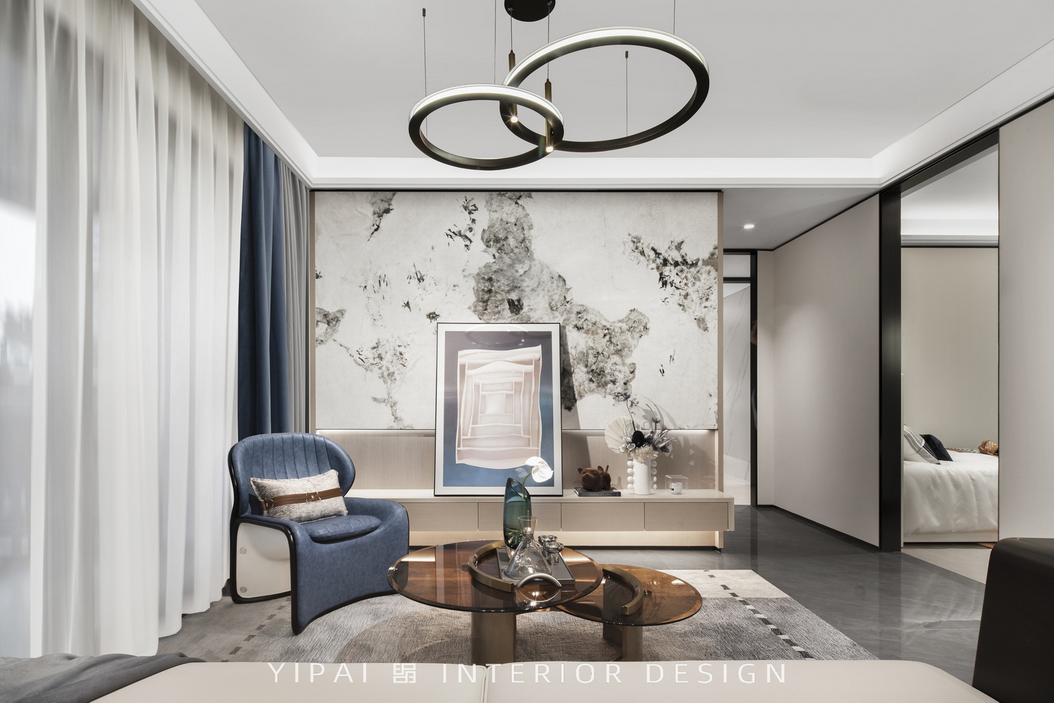 伊派設(shè)計(jì)采用現(xiàn)代風(fēng)格,將柏林灰藍(lán)色貫穿了各個(gè)生活空間,通過(guò)低重心設(shè)計(jì)處理手法,讓空間延展性更強(qiáng),藝術(shù)小品的點(diǎn)綴,空間被賦予了極高的藝術(shù)氣質(zhì)